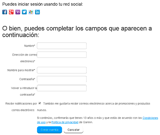 Se puede iniciar sesión con una cuenta de redes sociales, personalmente prefiero crear una cuenta de Garmin y no entrar/asociar otras cuentas de ninguna red social. Para ello necesitaremos unicamente un correo electrónico (que nos servirá, por ejemplo, si algun día olvidamos la contraseña).